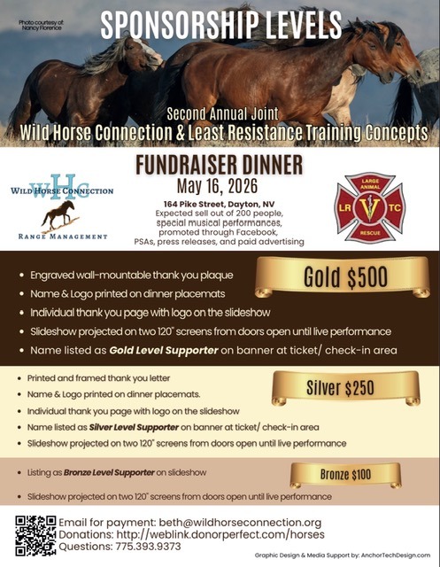It’s official—tickets for the 2026 Wild Horse Connection & LRTC Joint Fundraising Dinner are now on sale! Last year’s event sold out quickly, so don’t miss your chance to support two all-volunteer organizations and the iconic Virginia Range wild horses.Join us for a great evening while helping ensure that these horses and the teams that…